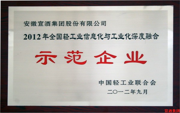 日前,中国轻工联合会表彰安徽宣酒集团股份有限公司获“2012全国轻工业信息化和工业化深度融合示范企业”荣誉称号。