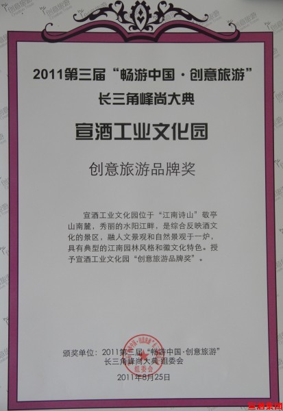 2011年8月25日——26日,由上海市创意产业协会主办的第三届“聚焦长三角•创意旅游”峰尚大典暨首届中国旅游文化品牌系列推广活动在江苏常州隆重召开。宣酒工业文化园荣获创意旅游品牌大奖。